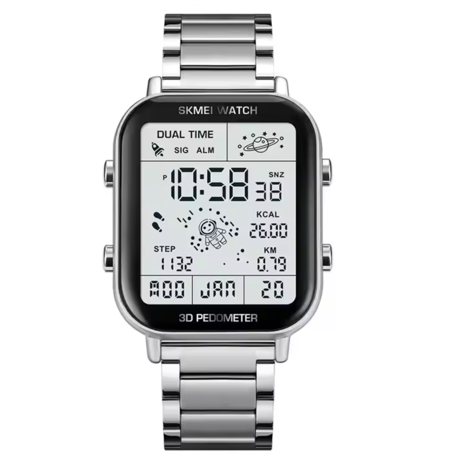 Alarm, Auto Date, chronograph, Day/Date, Waterproof, Week Display, Stop Watch, pedometer